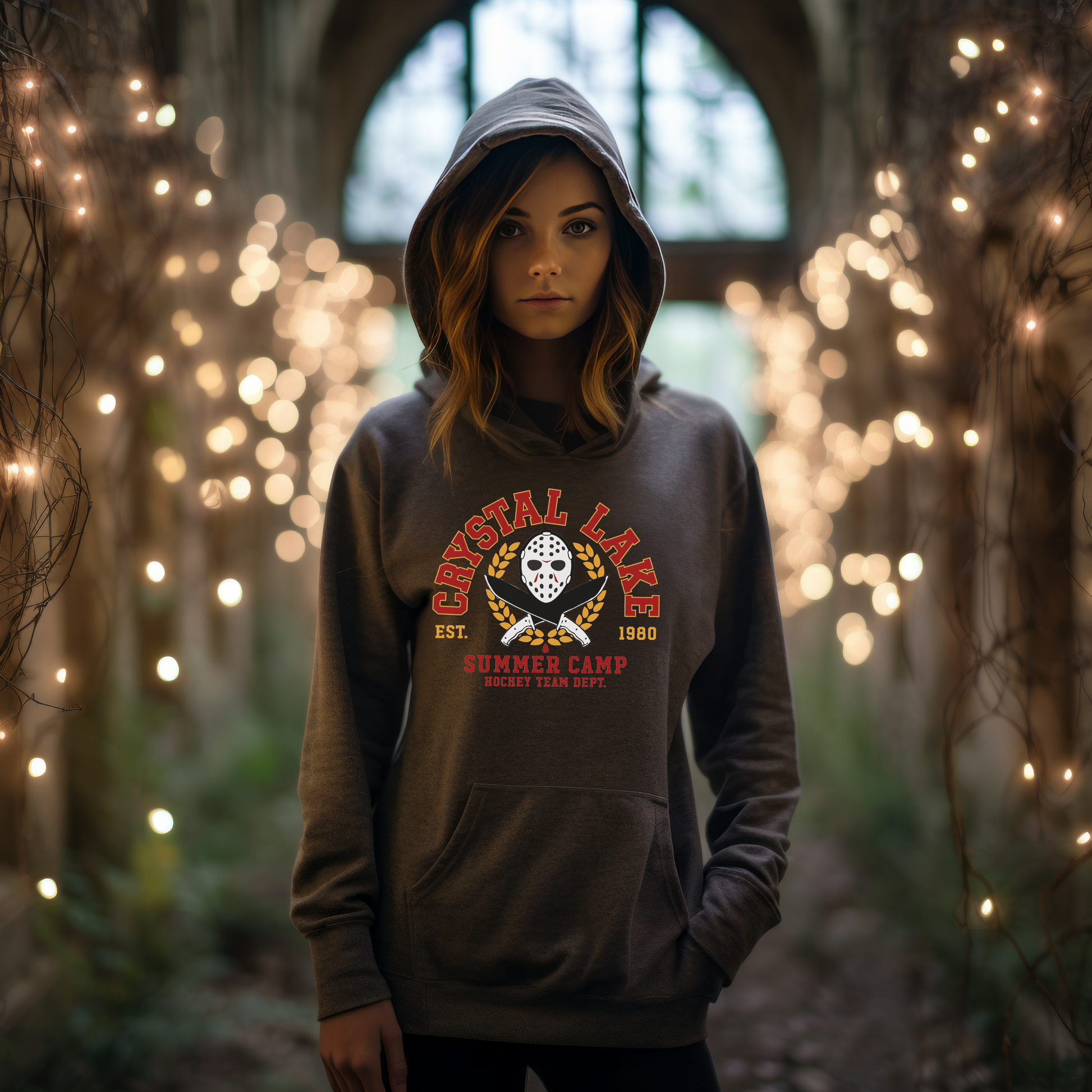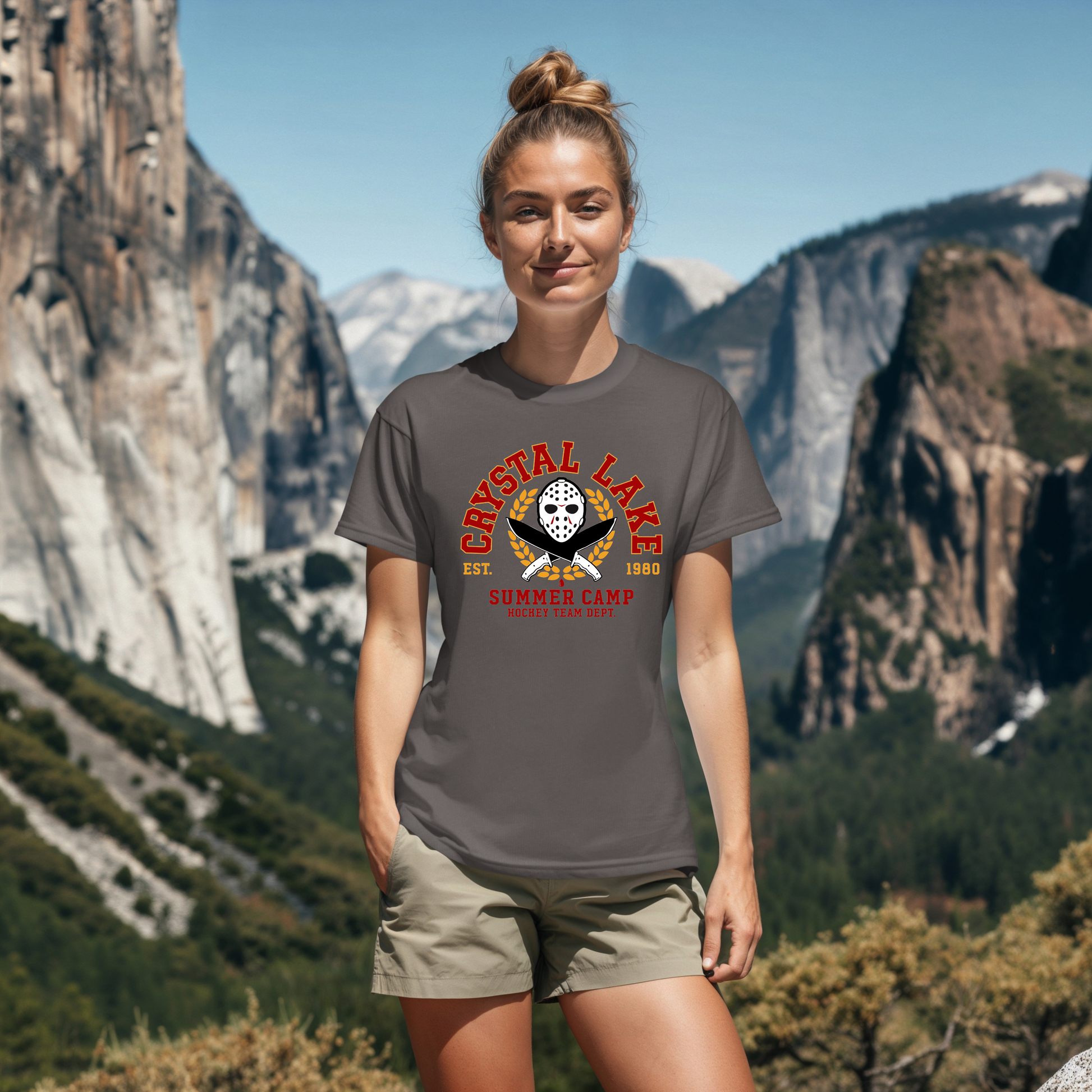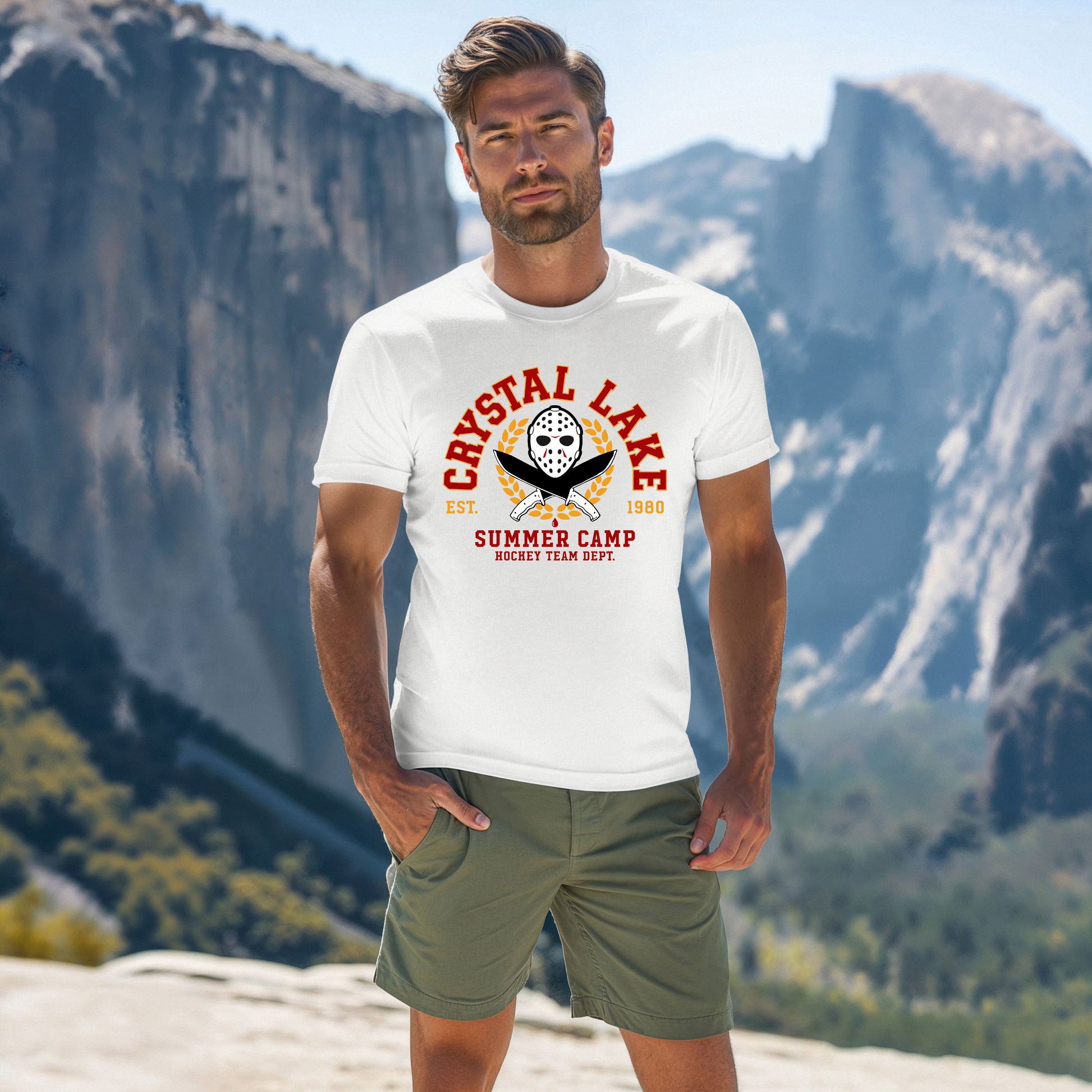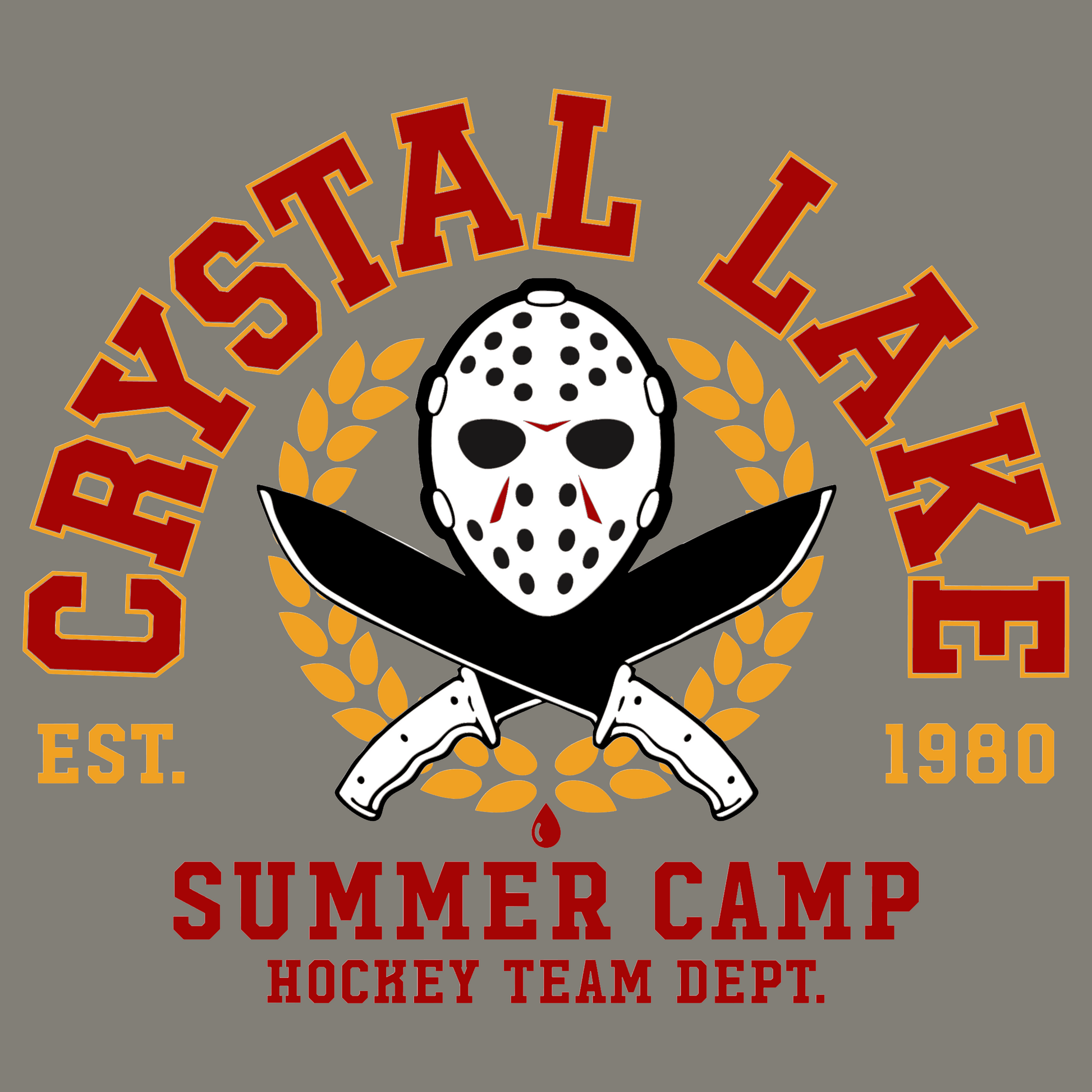Introducing the Crystal Lake Summer Camp Hockey Team Department! This eye-catching design features the infamous hockey mask, reminiscent of the classic horror film, flanked by two crossed knives, adding a playful twist to the camp theme. Perfect for fans of summer fun and thrilling adventures of horror, this design is sure to make a statement when out and about!